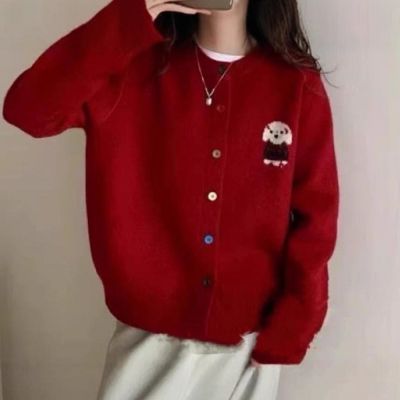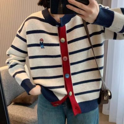 La Belleza圓領撞色滾邊小熊繡線橫條紋彩色鈕釦毛料針織毛衣