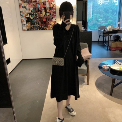 La Belleza減齡百搭素色後鬆緊腰雙釦水洗棉顯瘦A字裙擺工裝長裙