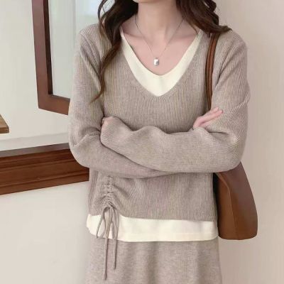 La BellezaV領羅紋領立體拼接格紋側下擺圓弧包心紗針織毛衣