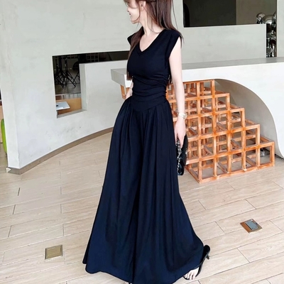La Belleza素色連身闊腿褲垂墬感滑料褲管側開叉寬鬆連身褲