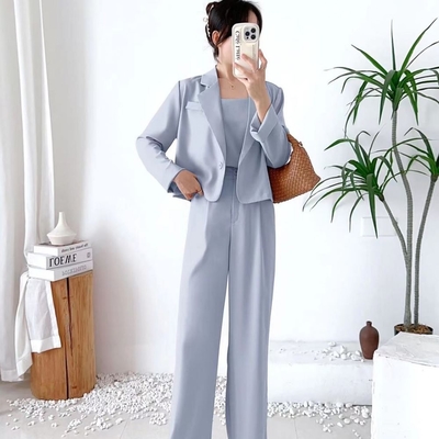 La Belleza簡約翻領單釦寬鬆西裝外套加細肩背心加鬆緊腰闊腿西裝長褲三件式$499