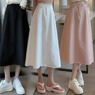 La Belleza減齡百搭素色後鬆緊腰雙釦水洗棉顯瘦A字裙擺工裝長裙$404$425