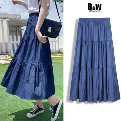 La Belleza韓版減齡素色鬆緊腰側口袋冰絲牛仔裙蛋糕裙$357$375