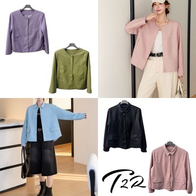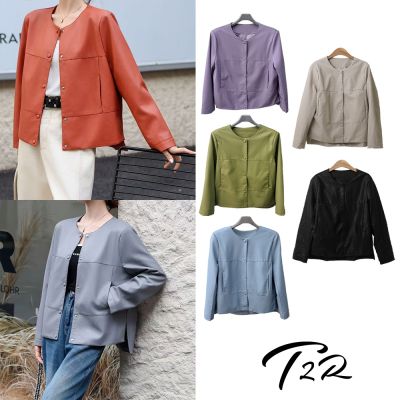 T2R-正韓空運-翻領皮革束口 / 圓領拼接圓釦 皮衣外套(多色)