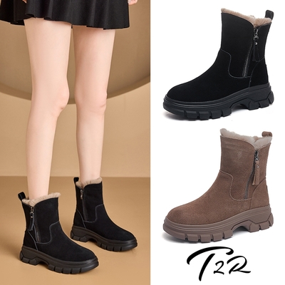 T2R-正韓空運-反絨真皮厚底短筒雪靴-增高約6公分-黑/卡其