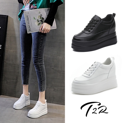 T2R-正韓空運-免綁帶真皮內增高厚底小白休閒鞋-增高約10公分-黑/白