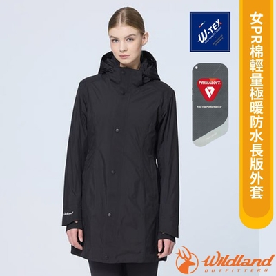 【荒野 WildLand】女 PR棉輕量極暖防水長版外套.連帽雪衣(可拆帽)_0B22901-165 印黑色