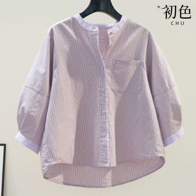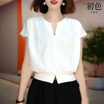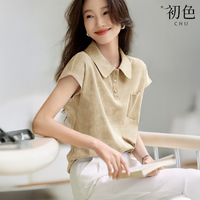 初色 新中式襯衫簡約純色立領五分短袖上衣女上衣-膚色-34619(M-2XL可選)$299