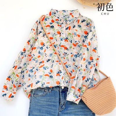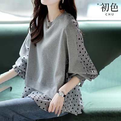 初色 短袖圓領寬鬆復古印花雪紡拼接針織衫T恤上衣-花色-69160(M-2X可選)$249