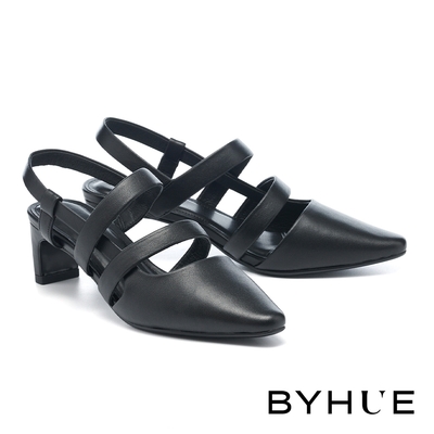 高跟鞋 BYHUE 韓系優雅純色羊皮軟芯繫帶方頭高跟鞋-黑