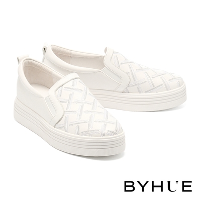 休閒鞋 BYHUE 率性舒適撞色電繡造型牛皮軟芯厚底休閒鞋-白