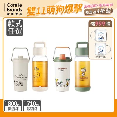 【美國康寧】(買一送一)Snapware SNOOPY 露營趣/復刻黑白系列鋅動輕瓷不鏽鋼保冰保溫杯800ml+提把隨行玻璃杯710ml
