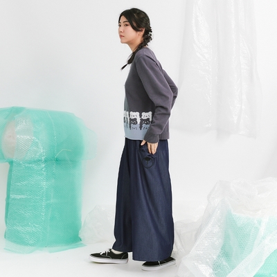 【Dailo】熊熊口袋仿牛仔剪接打褶長寬褲 淺藍 深藍 黑 (魅力商品)