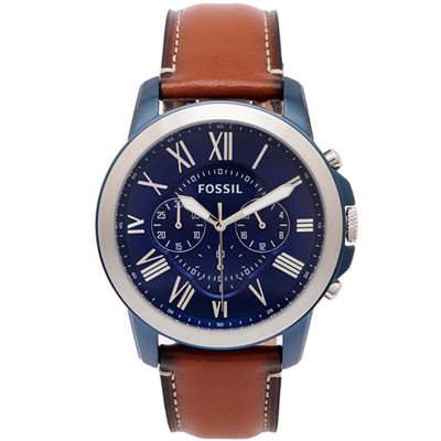 FOSSIL 羅馬優雅風計時的皮帶手錶(FS5151)-藍面X咖啡色/44mm