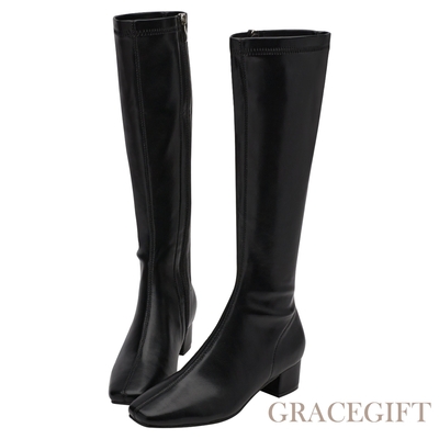 【Grace Gift】韓系方頭側拉鍊輕量瘦瘦長靴 黑