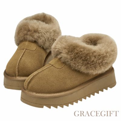 【Grace Gift】牛麂皮羊毛厚底雪地拖鞋 栗子