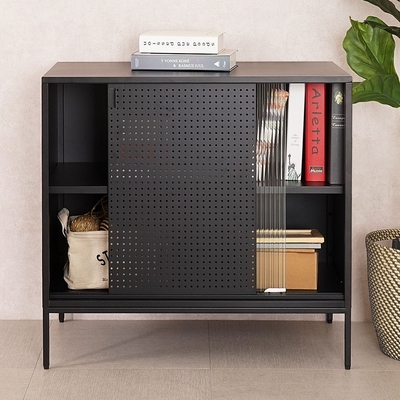 Homelike 喜家居鋼製滑門玻璃置物櫃-午夜黑(2240)-80x45x76cm