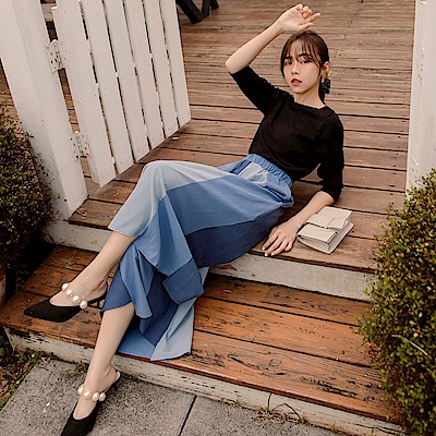 OB嚴選-不規則撞色剪裁腰鬆緊A字寬褲
