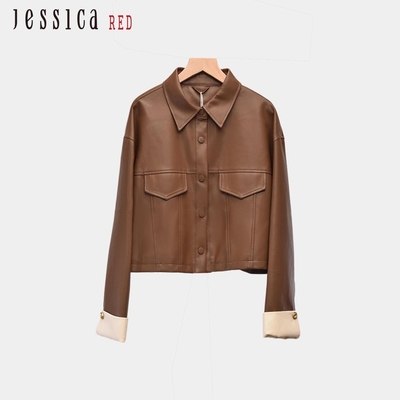 JESSICA RED - 百搭率性小翻領素色仿皮衣外套(咖)R44001$2,027$2,303