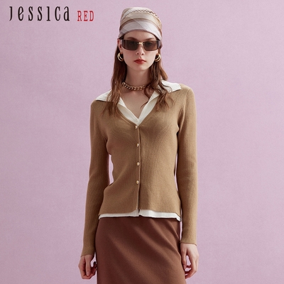 JESSICA RED - 氣質百搭翻V領假兩件拼接針織衫(褐)R45501$1,81289折