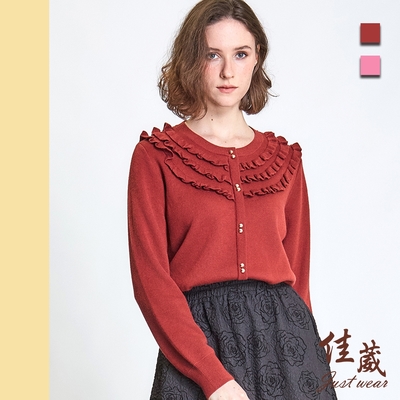 【佳葳Justwear】荷葉翻領針織上衣 2色(女上衣/女上著/素色/長袖/棉質/拼接/鑽釦)$550