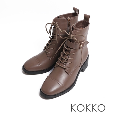 KOKKO個性俐落感繫帶微方頭粗跟短靴駝灰色$1,899