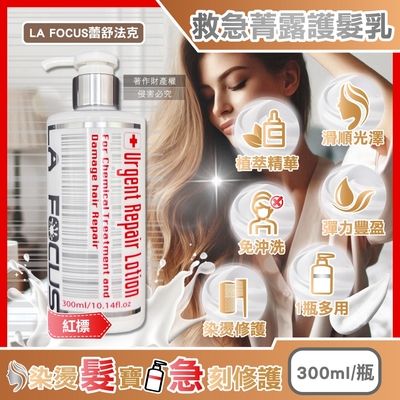 LA FOCUS蕾舒法克-光澤柔順免沖洗119救急菁露護髮乳300ml/瓶-紅標(植萃潤髮素,柔韌髮精華,沙龍級護色髮膜,染燙受損髮適用)$72288折