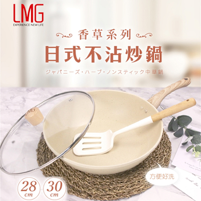 【LMG】香草系列日式不沾炒鍋-28CM(含蓋) 贈漏鏟+料理鏟組(隨機顏色)$9338折