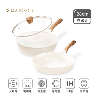 【MASIONS 美心】白翠玉瓷鍋 厚釜鑄造輕量IH不沾鍋(28cm加深炒鍋+28cm平底鍋+玻璃蓋 3件組)$1,480