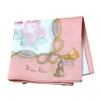 NINA RICCI PARIS 100%棉優美花卉圖騰品牌字母LOGO刺繡帕巾(白底/粉紅邊/45CM)