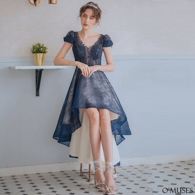 OMUSES 手工V領蕾絲前短後長藍色禮服