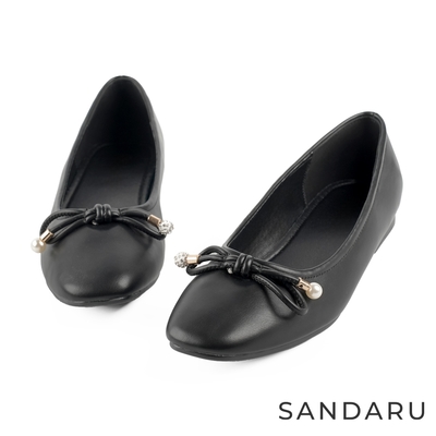 山打努SANDARU-娃娃鞋 真皮珍珠鑽蝴蝶結平底鞋-黑