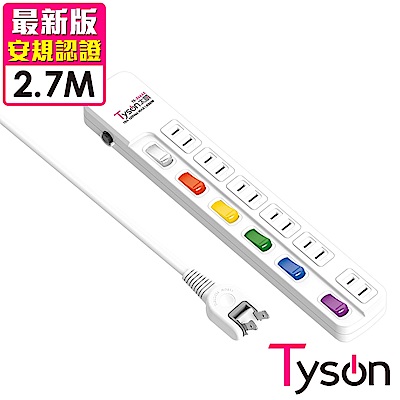 Tyson太順電業 376KS 3孔7切6座防塵蓋延長線(斜面開關/拉環扁插)-2.7M$749