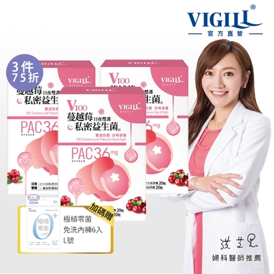 【VIGILL 婦潔】V100蔓越莓私密益生菌3入組贈滅菌免洗內褲6包(XL)