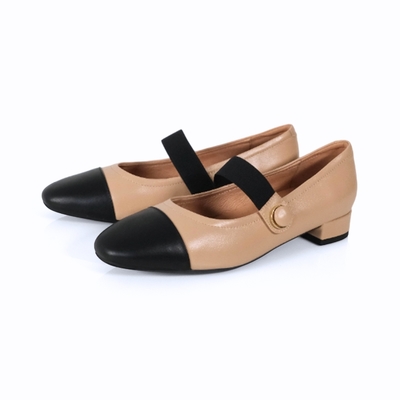 viina 真皮復古拼接瑪莉珍鞋-杏