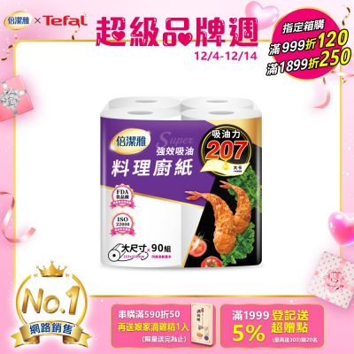 倍潔雅 強效吸油大尺寸料理廚房紙巾(90張x4捲/袋)