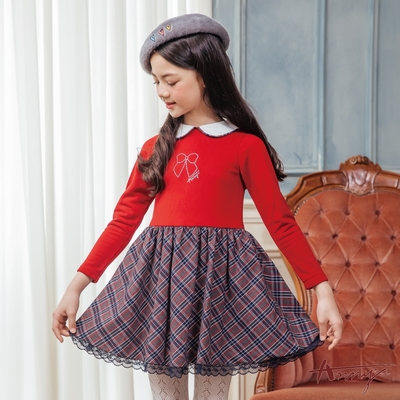 Annys安妮公主-水鑽蝴蝶結格紋拼接秋冬款天絲棉長袖洋裝*1616紅色