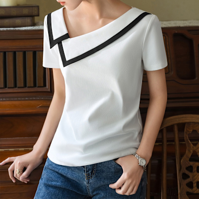設計所在 專注內搭系列 短袖T恤斜肩v領撞色領口上衣(2色 S-3XL可選)$63765折