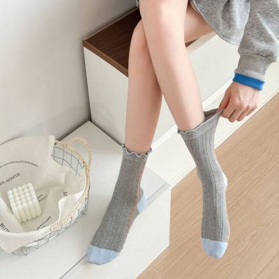 【HandStyle】女襪 時尚ins潮復古撞色海浪花邊中筒棉襪(73025)