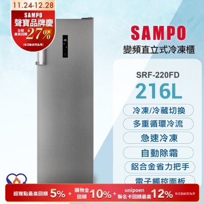SAMPO聲寶 216公升變頻直立式風冷無霜冷凍櫃含基本安裝+舊機回收[箱損新品]$14,302$15,054