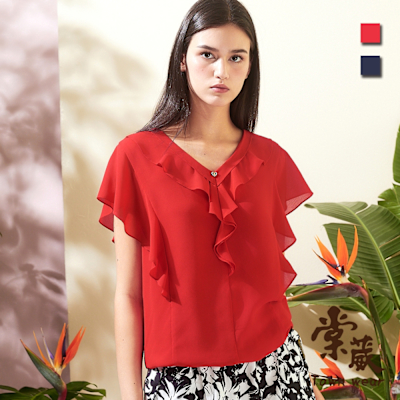 【TOWNWEAR棠葳】氣質荷葉鑽飾雪紡上衣 2色(中大尺碼/女上衣/女上著/短袖/翻領/鑽飾/素色/氣質/上班族)$1,200