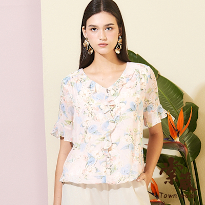 【TOWNWEAR棠葳】浪漫花語雪紡上衣(中大尺碼/女上衣/女上著/短袖/透膚/翻領/鑽飾/荷葉邊/氣質)$1,300