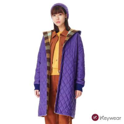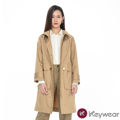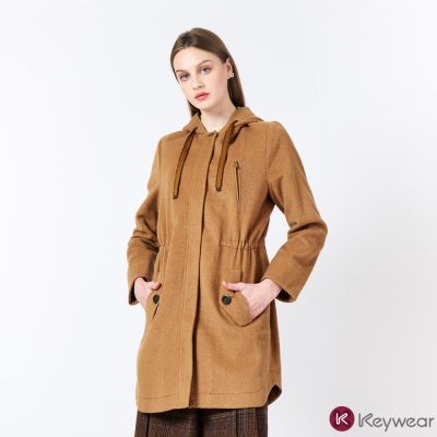 KeyWear奇威名品 毛呢連帽長袖長版外套-卡其色