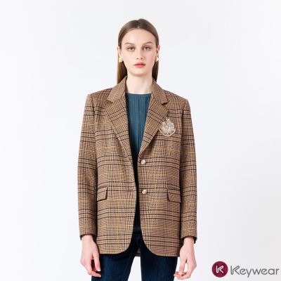 KeyWear奇威名品 復古千鳥格拼接長袖西裝外套-卡其色
