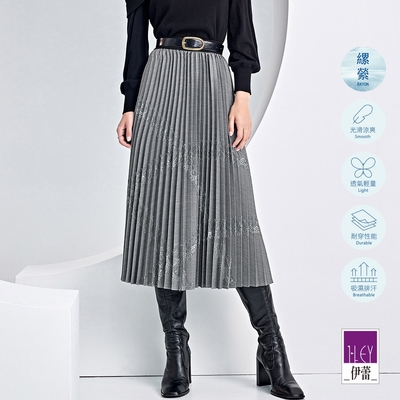 KeyWear奇威名品 百褶棋盤格裝飾腰帶長裙-黑色