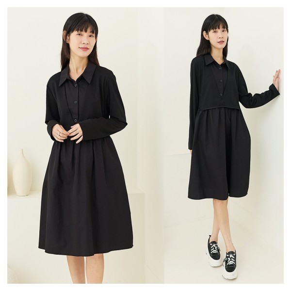T.Life 氣質異素材拼接長袖洋裝(2色)