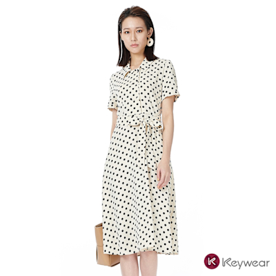 KeyWear奇威名品 復古波點短袖長洋裝-米色