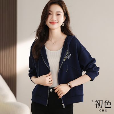 初色 簡約愛心閃電刺繡長袖拉鍊抽繩連帽外套-藏青色-30884(M-2XL可選)