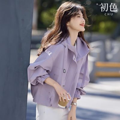 初色 休閒風純色簡約短款寬鬆抽繩連帽夾克外套女外套-共4色-11651(M-3XL可選)