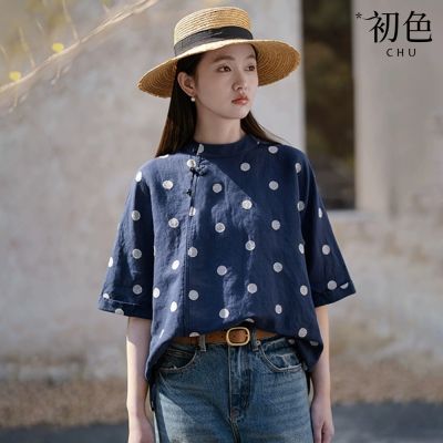 初色 法式復古風波點印花圓領五分袖襯衫上衣女上衣-藍色-14032(M-2XL可選)$5848折